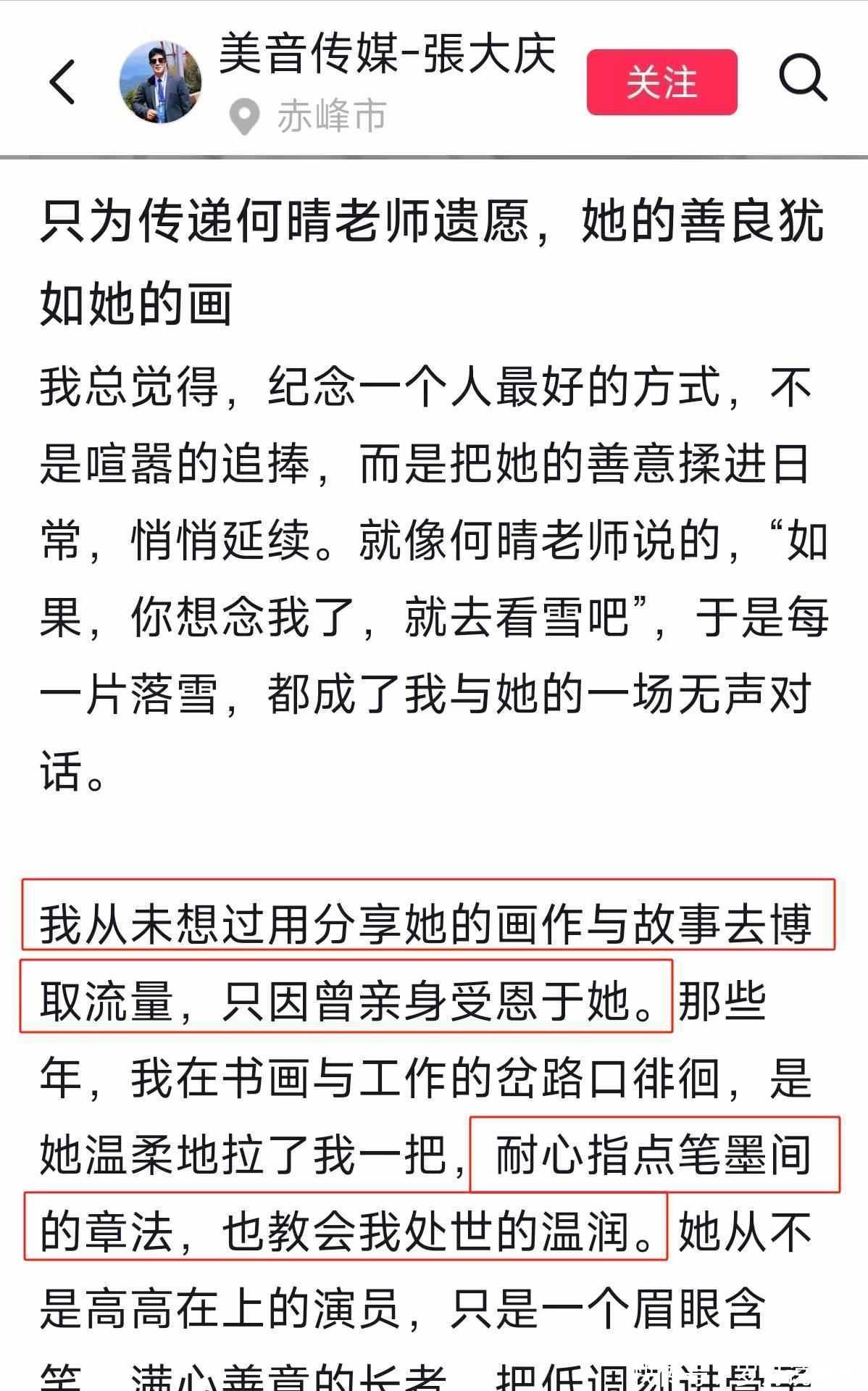 他提到何晴对他就像妈妈一样,教他画画,陪他度过困难的日子,还放了几张合影,看起来关系很近,他说自己在整理何晴的画,准备明年办个展览,这听起来很感人,但问题在于那些画根本不是何晴画的,而是他自己画的,他自己都承认了,可还是打着完成遗愿的名义。